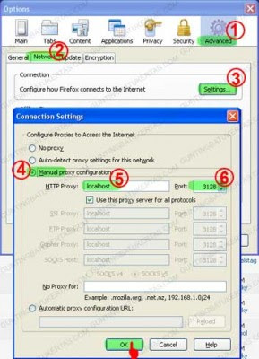 11. Selanjutnya, Ubah setting Browser Anda. Arahkan proxy pada browser anda ke alamat localhost dengan port 3128. Untuk Firefox, langkah setting nya tampak seperti berikut: